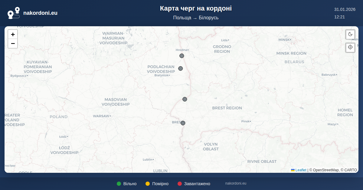 Інтерактивна карта кордону Польща — Білорусь з онлайн чергами, прогнозом та статусом переходів