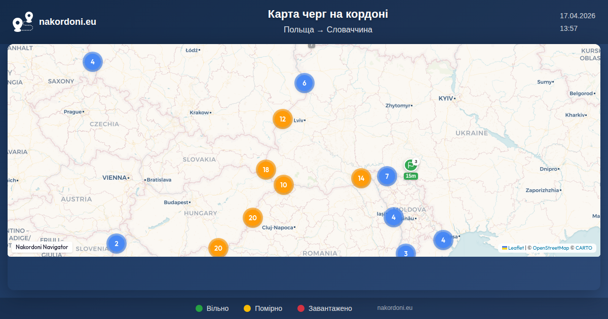 Інтерактивна карта кордону Польща — Словаччина з онлайн чергами, прогнозом та статусом переходів