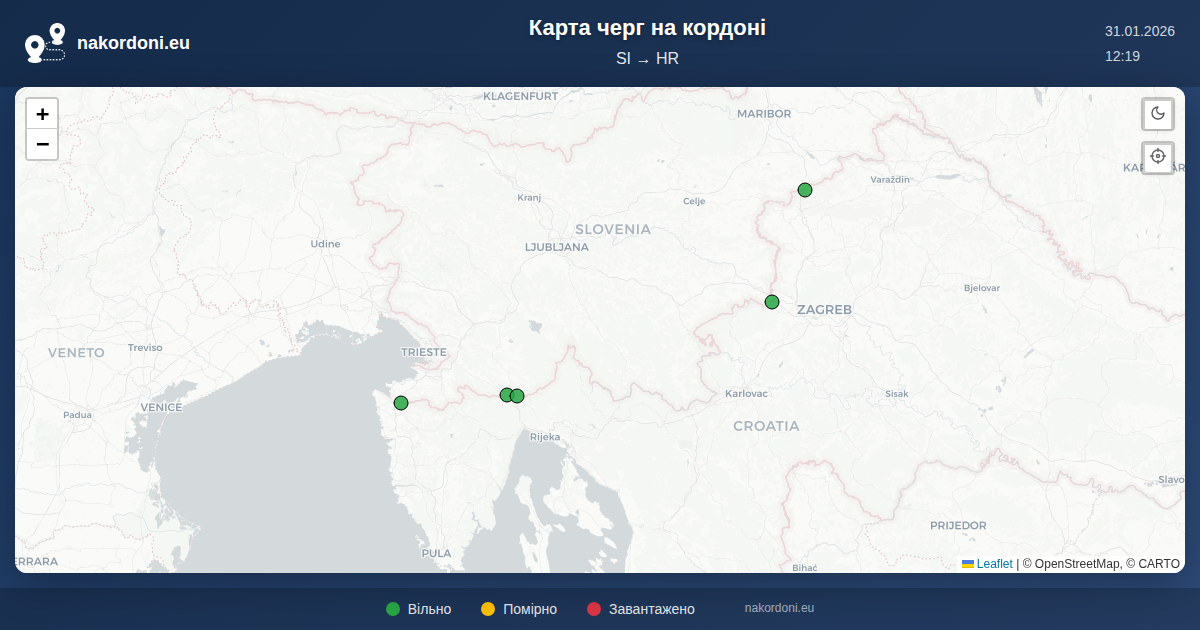 Інтерактивна карта кордону Словенія — Хорватія з онлайн чергами, прогнозом та статусом переходів