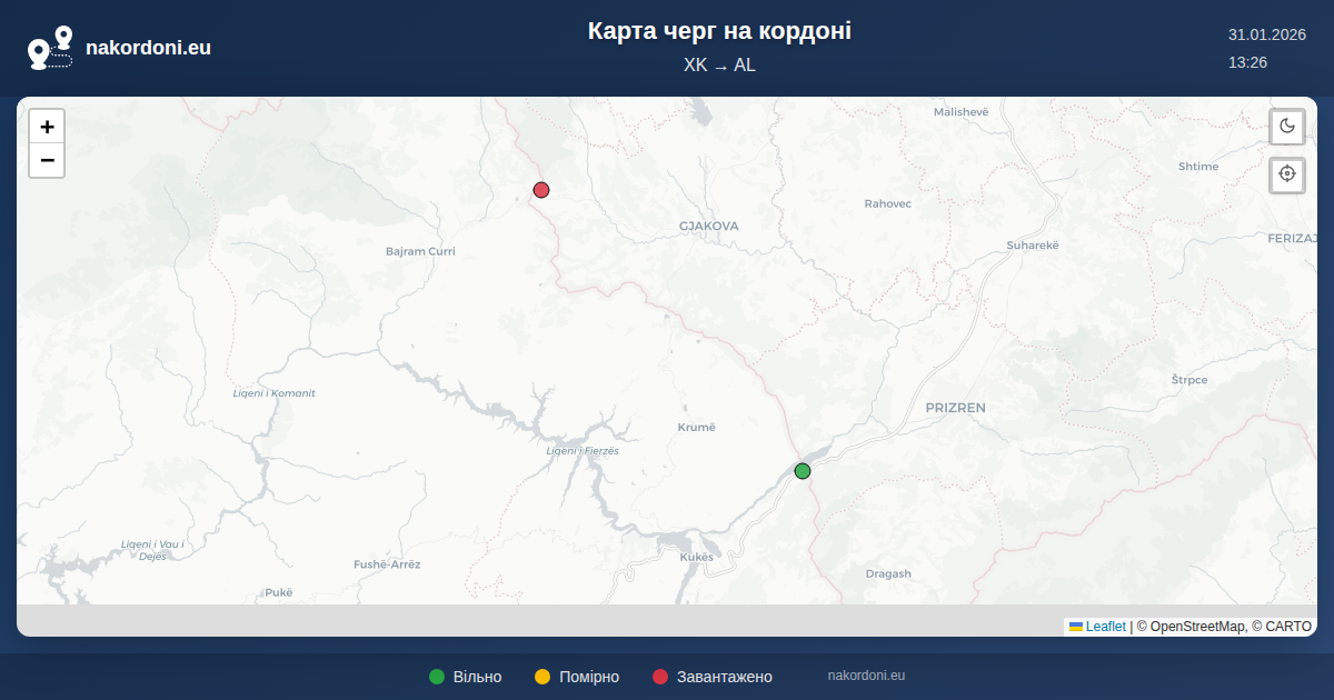 Інтерактивна карта кордону Косово — Албанія з онлайн чергами, прогнозом та статусом переходів